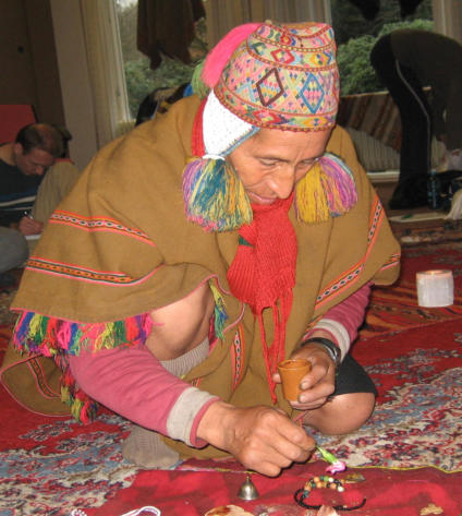 De Incasjamaan werkt met zijn mesa, dit is een bundel met heilige stenen.